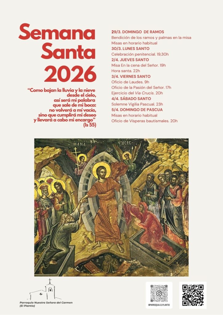 «Durante la Semana santa, la Iglesia celebra los misterios de la salvación actuados por Cristo en los últimos días de su vida, comenzando por su entrada mesiánica en Jerusalén. El tiempo de Cuaresma continúa hasta el jueves. A partir de la Misa vespertina «en la Cena del Señor» comienza el Triduo pascual, que continúa durante el Viernes de la Pasión del Señor y el Sábado Santo, y tiene su centro en la Vigilia Pascual y acaba con las Vísperas del domingo de Resurrección» (Carta Circular sobre las fiestas pascuales 1988). Han llegado los días más importantes del año para los cristianos. Aquí tienes la agenda de las celebraciones litúrgicas de estos días. Si te quedas en Madrid, prepara y participan en estas celebraciones con nosotros. Las celebraciones del Jueves, Viernes y Sábado Santo se celebran todas en la iglesia parroquial, en El Plantío. Las misas dominicales, según horario y lugar habitual.