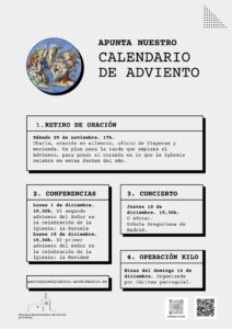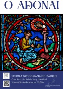 Igualmente, siempre añadimos una opción musical para profundizar en la espiritualidad del Adviento y la Navidad: el jueves 18 tendremos un elegante concierto que nos llevará a las raíces de este tiempo y a la cultura musical de la Iglesia: la Schola Gregoriana de Madrid, dirigida por Francesco Ercolani, nos ofrecerá el concierto O Adonai. Están todos invitados a una hora de preparación musical, en el templo parroquial.