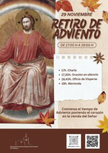 El domingo 30 de noviembre comienza un nuevo año litúrgico, el ciclo de Mateo, que nos acompañará y guiará durante el próximo año. Con él, comienza el tiempo de Adviento, uno de los tiempos fuertes de la espiritualidad del cristiano. Conviene vivirlo adecuadamente, tomando conciencia de la necesidad de estar en vela, acogiendo al Señor en toda circunstancia de nuestra vida, como preparación para su venida gloriosa. Desde la parroquia, queremos recordaros la importancia de programar este tiempo y de profundizar adecuadamente en él, más aún por la peligrosa mezcla con elementos de consumo y despiste que la sociedad ofrece en estas fechas. Por eso, queremos comenzar ofreciendo a todos un tiempo de silencio y oración, una tarde de retiro, en la que comprendamos un poco mejor y deseemos hacer nuestro este tiempo al que no terminamos de cogerle el sentido. Será el sábado 29, a las 17 horas, en el templo parroquial. El retiro comenzará con una charla de meditación, seguida de un largo rato de oración en silencio. Concluiremos rezando las vísperas, con las que la Iglesia Católica abre el tiempo del Adviento, a las 18,40, y merendando juntos en el salón parroquial, para celebrar también este feliz tiempo y su feliz noticia para nosotros. Estamos todos invitados a programar de esta forma espiritual esta tarde de sábado y a invitar a otros a comenzar también el Adviento rezando.