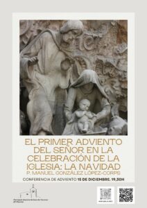 El lunes 15, a las 19,30h, el padre Manuel González disertará sobre el tema: «El primer adviento del Señor en la celebración de la Iglesia: la Navidad». Un tema oportuno para acabar bien el Adviento y enfilar la preparación inmediata de la Navidad. Invitemos a algún amigo o familiar a un rato de formación sobre un tema muy interesante sobre el que conviene tener buena formación, el lunes 15 en el templo parroquial.
