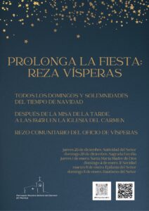 La Iglesia tiene una oración oficial que reza cada tarde y que se llama Vísperas. Con el libro de los Salmos, hacemos cada tarde memoria de Jesucristo en la espera de un día en el que no haya atardecer. Por eso, cada domingo la parroquia ofrece a todos los feligreses la posibilidad de terminar el Día del Señor con la oración oficial de la Iglesia, y un grupo de feligreses se reúne para esta oración cada domingo. Durante este tiempo de Navidad, la ampliamos también a los días festivos, con la intención de ayudar a quienes, después de haber ido a misa, se olvidan del día santo que celebramos: ir a la iglesia de nuevo, rezar juntos, es retomar, prolongar el día festivo. Invitamos a todos a unirse a esta oración con toda la Iglesia, y a encontrar en ella un refuerzo piadoso para no perder el sentido de las fiestas. Todos los domingos y festivos, después de la misa de las 19 horas.
